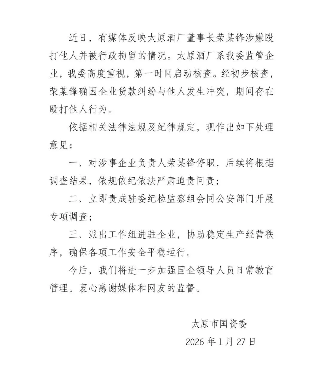 近日,有媒体反映太原酒厂董事长涉嫌殴打他人并被行政拘留的情况。太原酒厂系我委监管企业,我委对此高度重视,已第一时间组织相关部门召开专题会议,并同步启动核查。经初步核查,该企业负责人荣某锋确因企业货款纠纷与他人发生冲突,期间存在殴打他人行为。 依据相关法律法规及纪律规定,现作出如下处理意见: 一、对涉事企业负责人荣某锋停职检查,后续将根据调查结果,依规依纪依法严肃追责问责; 二、立即责成驻委纪检监察组会同公安部门开展专项调查; 三、派出工作组进驻企业,协助稳定生产经营秩序,确保各项工作安全平稳运行。