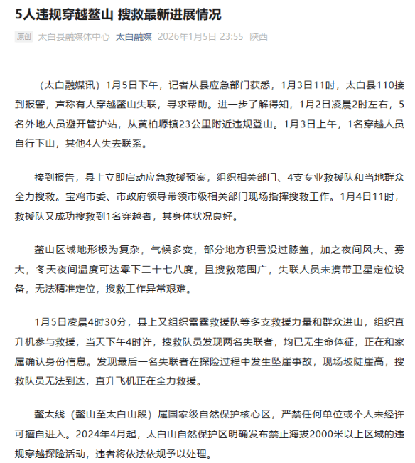 1月5日,太白县融媒体中心发布《5人违规穿越鳌山 搜救最新进展情况》,在此次失联事件中,剩余三名人员中,两名已经被发现,无生命体征;一人发生坠崖事故救援力量暂无法抵达。