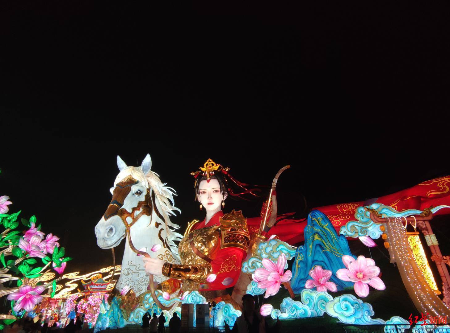 ▲本届灯会灯组 袁伟摄 特色灯组方面,有C位灯组“神奇华夏”,它以《庄子·逍遥游》中“鲲鹏”的宏大意象为蓝本,打造了这座全长210米的巨型彩灯。该灯组借鲲鹏展翅之姿,隐喻中国航天从古代飞天遐想到当代“探空、深潜、造器”的跨越腾飞。游客进入灯组内部,中国古代神话中夸父追日、祝融探火、嫦娥奔月等经典场景依次呈现。还有总长180米的“木兰传奇”灯组,该灯组通过“织甲赴戎行”“铁血丹心”“荣归故里”“新年团聚”“魂佑山河”等七个篇章递进叙事,完整再现木兰的传奇一生。其中,巨型花木兰与她的白马“千里雪”半身像,最高处达18米,仅花木兰的披风长度就有40米。