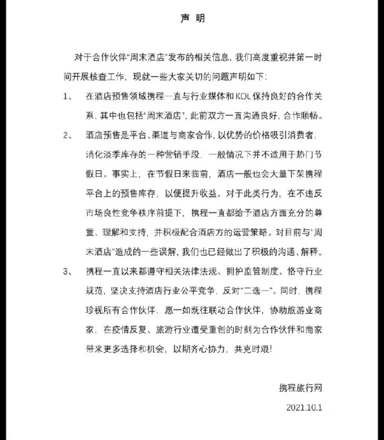 国庆节长假,在各地迎来旅游高峰同时,酒店预定平台“周末酒店”与携程却起了“二选一”纷争。 10月2日,针对携程“误解”的回应,周末酒店再发申明称,今年3月份以来,其合作酒店多次迫于携程压力下架在“周末酒店”上的合作产品,4月中就已向携程方面就封杀表达了不满,但未得到积极反应和致歉。截至发稿前,携程尚未进行第二轮回应。 周末酒店举报携程实施“二选一” 10月1日,国庆长假第一天,周末酒店举报携程实施“二选一”消息,登上了热搜。9月30日晚,周末酒店在全国12351平台举报携程“二选一”。 ![]() 周末酒店发出的举报信称,9月29日,“周末酒店”度假APP连续接到各大合作酒店通知下架发布于该平台上的产品要求。原因是酒店收到携程旅行网通知,要求与“周末酒店”度假APP有合作关系的酒店下架发布于该平台上的产品,否则将面临携程取消特牌、限流等处罚和限制。 “周末酒店近年一直备受来自携程的打压。尤其今年疫情得到控制、行业复苏之际,三月份、五一节前、国庆节前,酒店多次迫于携程压力下架与‘周末酒店’合作的产品。”周末酒店在举报信中称。 据周末酒店透露,截至9月30日19:00,其已收到五十多家酒店下架合作产品要求,导致在国庆假日高峰段无法正常售卖这些酒店的产品,预计直接损失近百万。 周末酒店表示,携程旅行网在无正当理由情况下,限制酒店供应商与其他平台合作的行为,是一种典型的利用大平台优势进行垄断,严重违反了《中华人民共和国反垄断法》第十七条“禁止有市场支配地位的经营者从事滥用市场支配地位的行为条例:没有正当理由,限定交易相对人只能与其进行交易或者只能与其指定的经营者进行交易。” 在举报信中,周末酒店提出三条要求,即要求携程旅行网停止要求酒店与“周末酒店”终止合作的行为;携程旅行网取消对与“周末酒店”有合作关系的酒店摘掉特牌、限流的限制规则以及酒店因该事件导致“周末酒店”被迫下架的产品重新上架。 ![]() 携程回应是“误解”反对“二选一” 在周末酒店发出举报信后,10月1日晚间,携程发布声明称,酒店预售是平台、渠道与商家合作,以优势的价格吸引消费者,消化淡季库存的一种营销手段,一般情况下并不适用于热门节假日。在节假日来临前,酒店一般也会大量下架携程平台上的预售库存,以便提升收益。 ![]() 针对周末酒店的实名举报行为,携程在声明中回应是“误解”,“对目前与‘周末酒店’造成的一些误解,携程已做出积极的沟通、解释。” 携程同时表示,支持酒店行业公平竞争,反对“二选一”。 ![]() 周末酒店不买账再发申明 针对携程给出的“误解”,周末酒店并不买账。10月2日,周末酒店再发申明,称今年3月以来,合作酒店已多次迫于携程压力下架在“周末酒店”上的合作产品,今年4月中就已向携程方面就封杀直接表达了不满和愤慨,但未得到积极反应和致歉。 ![]() 在申明中,周末酒店表示,今年3月到此次国庆节,相关酒店要求其下架产品的理由均被告知是应携程的要求,周末酒店掌握大量事实和证据。 周末酒店在申明中还透露,自9月30日晚举报后,携程相关人员一直联系,把封杀行为推到酒店自身运营行为,不仅没有就封杀行为回应其诉求,还不断施压要求撤回举报。 周末酒店认为,携程旅行网并非如他们自我标榜的一贯遵纪守法,之前恰恰屡见有关“携程或明或暗对同行封杀、胁迫酒店“2选1”,对消费者捆绑销售和大数据杀熟”的大量报道,再加上目前已有消费者就大数据杀熟对携程胜诉的案例。 他们表示,这次选择不再沉默和忍让,不再害怕事后打击报复,坚决反对和声讨这种不正当竞争行为,呼唤的只是市场的公平竞争,将会通过各种途径维护属于自己的合法权利。 ![]() 监管接连对平台经济“二选一”出重拳 周末酒店与携程的纷争,是“误解”还是“垄断”,有待监管部门的调查。 事实上,平台经济的“二选一”由来已久,近年来,时不时有平台被曝出“二选一”问题。 2021年以来,监管部门针对平台经济“二选一”问题接连祭出重拳:4月10日,国家市场监管总局对阿里巴巴垄断行为罚款182.28亿元;4月13日,国家市场监管总局会同有关部门召开互联网平台企业行政指导会,重申强迫实施“二选一”问题必须严肃整治;4月26日,国家市场监管总局对美团实施“二选一”等涉嫌垄断的行为立案调查;7月7日,国家市场监管总局发布《市场监管总局依法对互联网领域二十二起违法实施经营者集中案作出行政处罚决定》,涉及阿里、腾讯、苏宁等公司,对涉案企业分别处以50万元人民币罚款。 9月6日,国家市场监管总局局长张工在国新办新闻发布会上表示,针对社会反映强烈的头部平台企业“二选一”垄断行为,市场监管总局依法查处,强化重大典型案例警示震慑效应,顶格处罚45起平台企业未依法申报案件并向社会公布。 张工强调,下一步将进一步健全公平竞争法律制度体系,不断强化反垄断反不正当竞争监管执法,注重竞争监管与行业监管协同联动,着力构建全方位、多层次、立体化监管体系,坚决反对垄断和防止资本无序扩张,为包括平台企业在内的各类市场主体创造公平竞争市场环境。 |